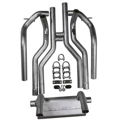 Dit is een Flowmaster american thunder uitlaatsysteem 2.5 inch (vanaf de headers) met balance pipe en enkele crossflow demper vanaf de voor de Camaro en Firebird-TA van '67 t/m '74 (volgens de fabrikant),is met enige aanpassing ook voor de '75 t/m '81 bodys te gebruiken (past niet op de '67 t/m '69er convertible).